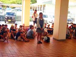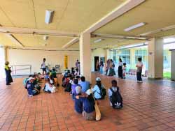 最初の集合挨拶 消しゴムつくりについての説明 原料の塩化ビニルの計量
