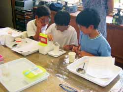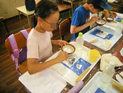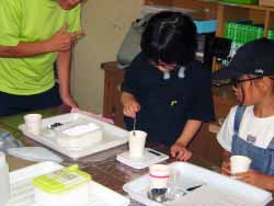 相談しながら秤を使っての計量 しっかり混ぜる程良い消しゴムが出来ます