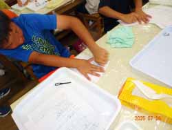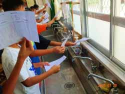 型枠に入れて 押し固めます 石灰水に息を吹き込んで二酸化炭素の確認