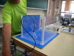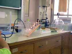 二酸化炭素が水に解ける実験 二酸化炭素の入った槽にシャボン玉を落とす ローソクが順番に消えていく実験